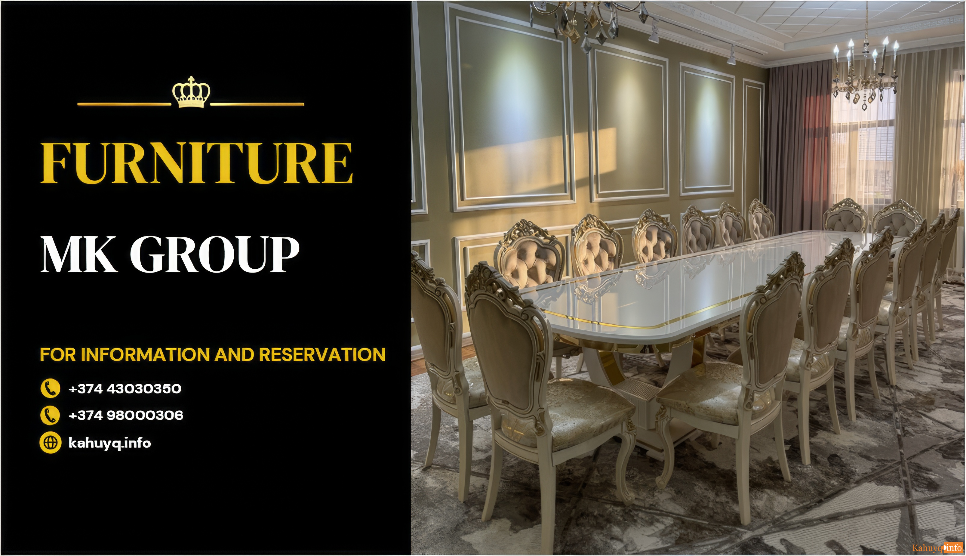 Կահույքի որակյալ, բարձրաճաշակ և Հայաստանում ամենալայն տեսականին, անմիջապես ներմուծողից մեծածախ գներով MK Group Կահույքի Սրահ – ում: Ամենաանհավանական թվացող մտահաղացումները համադրվելով որակի, շքեղության ու մատչելի գների հետ կլրացնեն ցանկացած ինտերիեր: Նշենք, որ kahuyq.info-ն «ՄԿ Գրուպ»-ի պաշտոնական կայքէջն է: